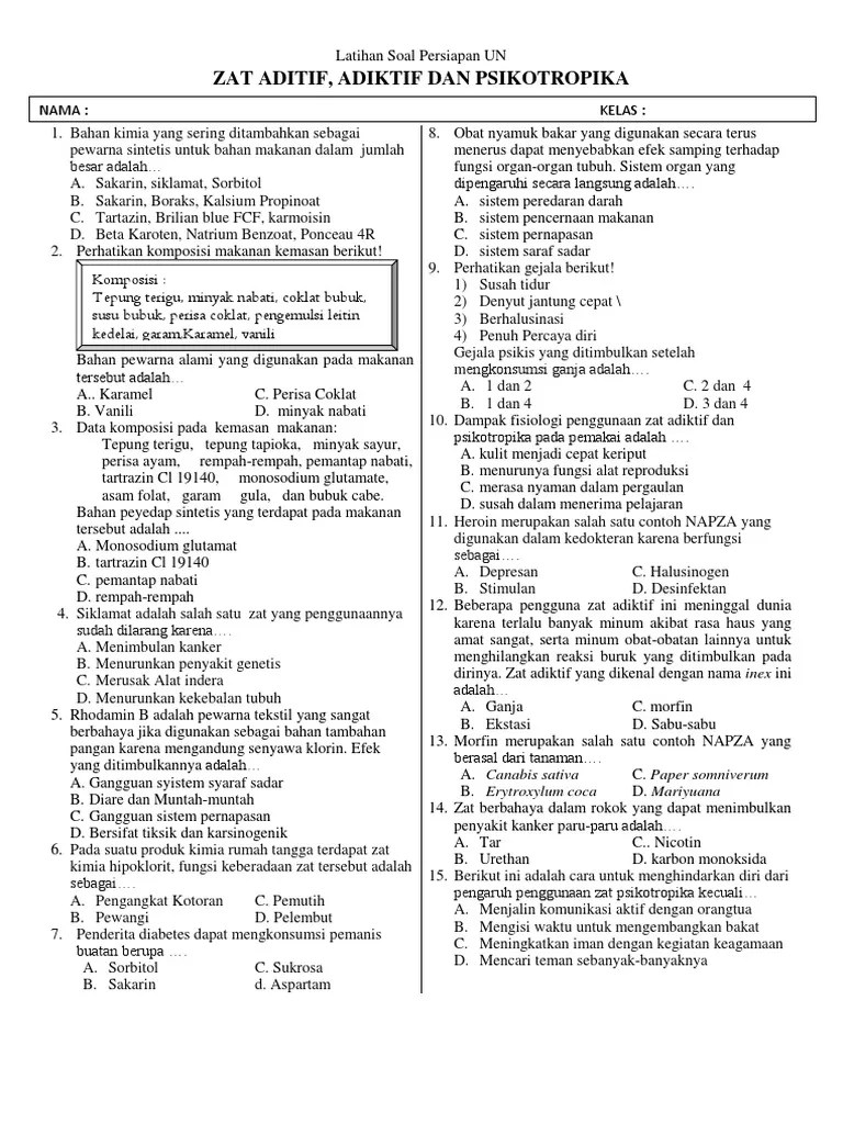 Soal dan jawaban zat aditif dan adiktif kumpulan contoh surat dan soal terlengkap . Latihan soal untuk bab ini akan saya bagi menjadi dua bagian yaitu part pertama adalah tentang zat aditif dan part kedua, pada posting . Penyusunan soal ujian sekolah berstandar nasional pusat penilaian pendidikan badan penelitian dan pengembangan kementerian pendidikan dan kebudayaan. Apa saja yang termasuk zat adiktif dan psikotropika serta. Berikut ini 40 soal ipa kelas 8 semester 1 beserta kunci jawaban, selamat membaca. Zat aditif pada makanan dapat dibedakan menjadi dua, yaitu zat aditif alami dan zat aditif buatan. · ibu akan membuat nasi kuning. Zat aditif alami merupakan zat tambahan . Adapun ciri psikis merupakan ciri yang berhubungan dengan perasaan atau pikiran, misalnya selalu berhalusinasi dan percaya diri. Petunjuk mengerjakan pilihlah salah satu jawaban yang paling benar dengan memberikan tanda silang x pada huruf a b c atau d. Kumpulan contoh soal zat aditif, adiktif, dan psikotropika dilengkapi dengan kunci jawaban terbaru dalam mata pelajaran ipa kelas viii revisi.